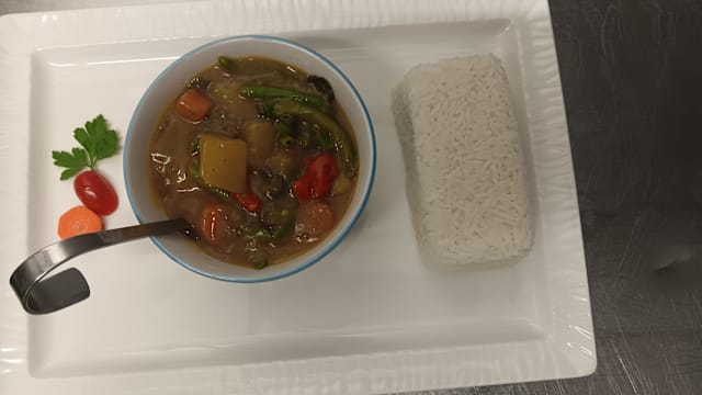 - Riz maison aux petits légumes ; salade verte , riz blanc parfumé ; bananes aloko ( +3 ) ; frites de patates douces (+ 3 €