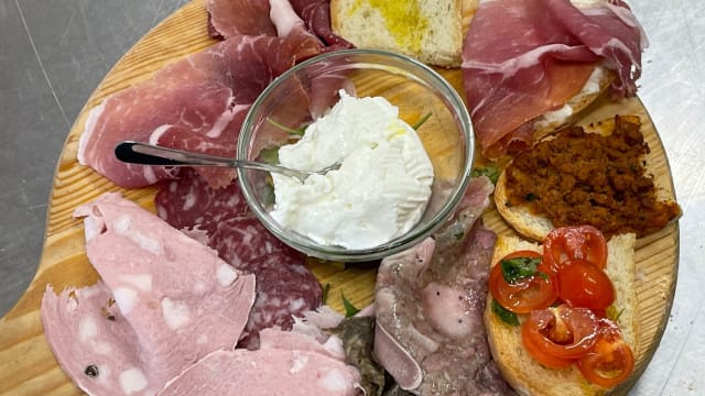 Fiocco di prosciutto, salsiccia passita, formaggio montanaro, piadina al testo e pizza fritta. Ham roulade, dried sausage, mountain cheese, thin flatbread cooked on a griddle, and fried pizza