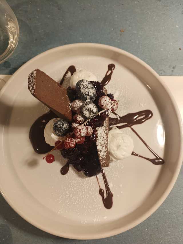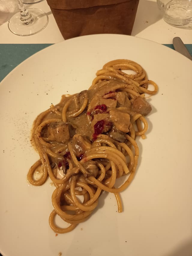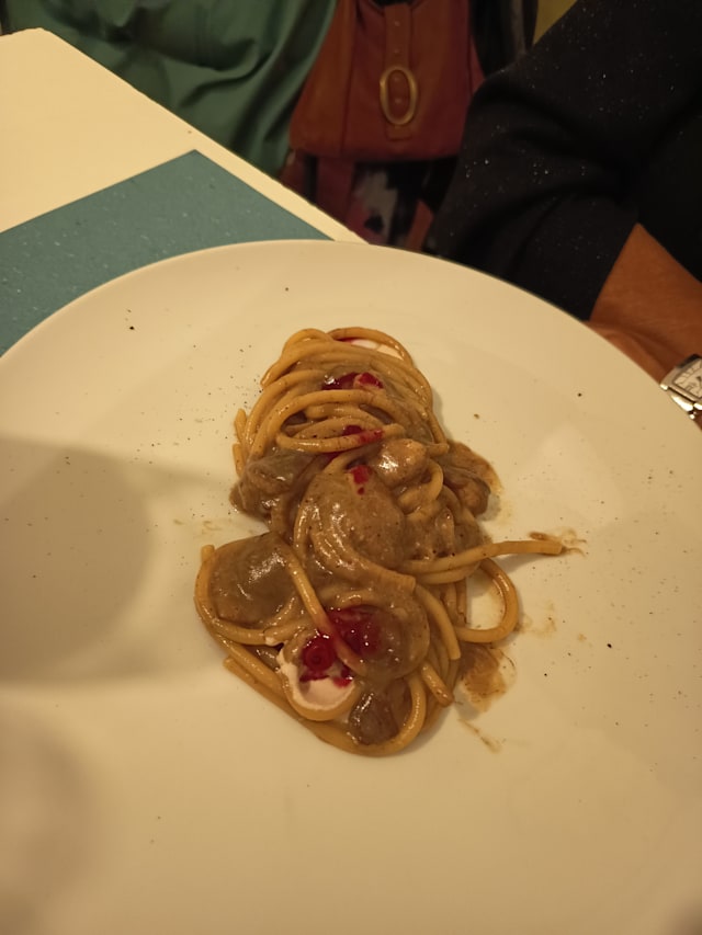 Spaghetti alla chitarra ai funghi porcini mantecati con la loro acqua fermentata e serviti con crumble di nocciole tostate e cacao amaro. A finire, frutti di bosco scottati e polvere di porcino