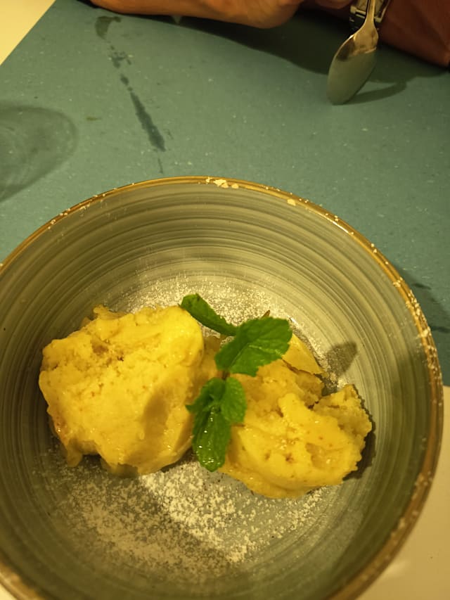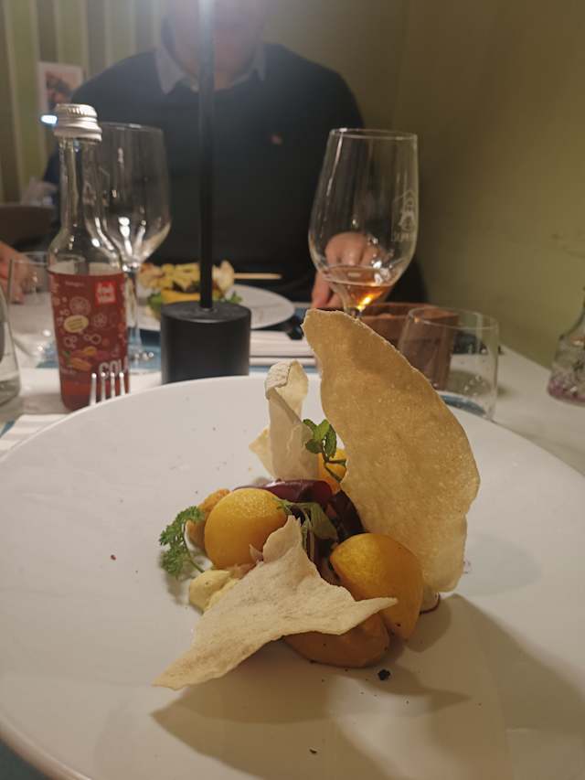 Sfere di patate cotte sottovuoto con zafferano e odori su crema di zucche arrostite e maionese dal loro olio di cottura, rapa marinata, crumble di tartufo, papadums e foglie di menta