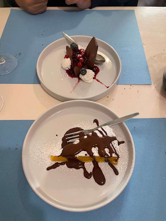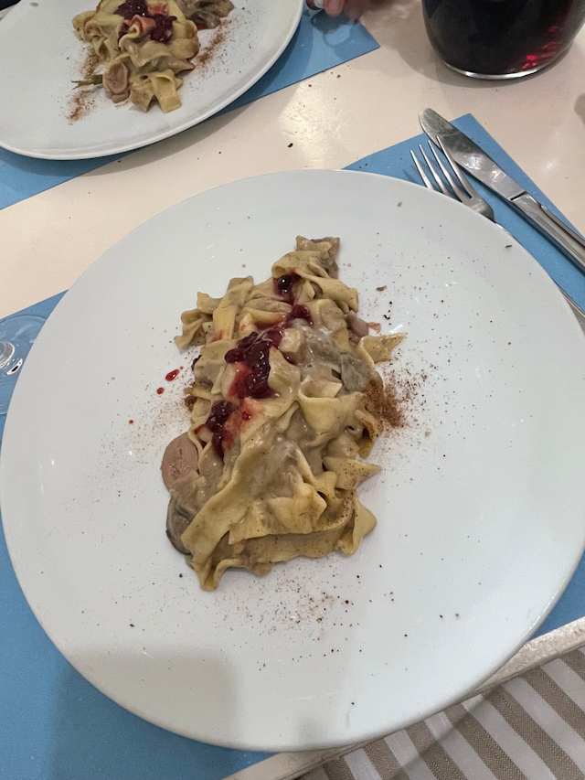 - Spaghetti alla chitarra ai funghi porcini mantecati con la loro acqua fermentata e serviti con crumble di nocciole tostate e cacao amaro. A finire, frutti di bosco scottati e polvere di porcino