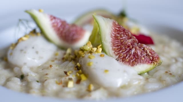 Risotto con crema di castagne e anacardi mantecato con olio al rosmarino e arancia candita. Rifinito con cristalli di sale affumicato e pinoli tostati