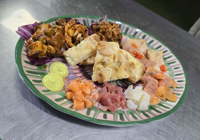 Tartare di tonno, datterino, pesto alla menta, cipolla fritta croccante, stracciatella, olio evo bio.