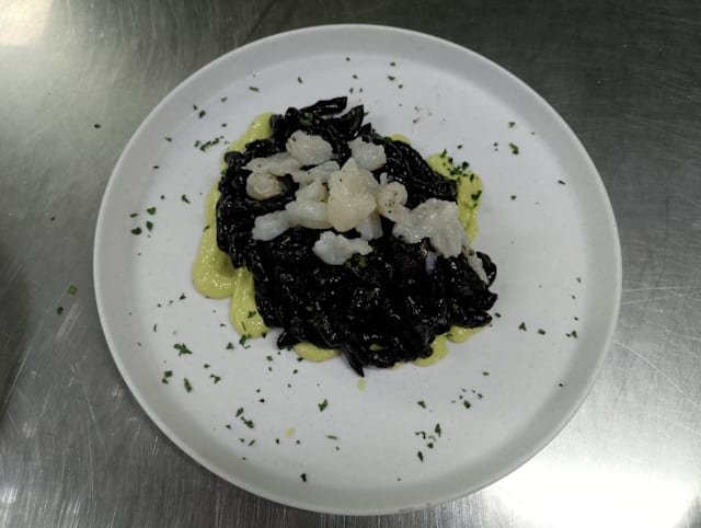 Tartare di scampi, crema di avocado e basilico, lattughino, olio evo bio