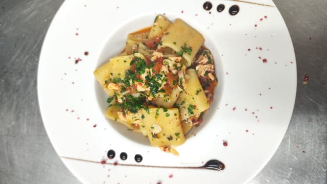 Spaghetti di pasta fresca con pistacchio, stracciatella di bufala e gambero rosso