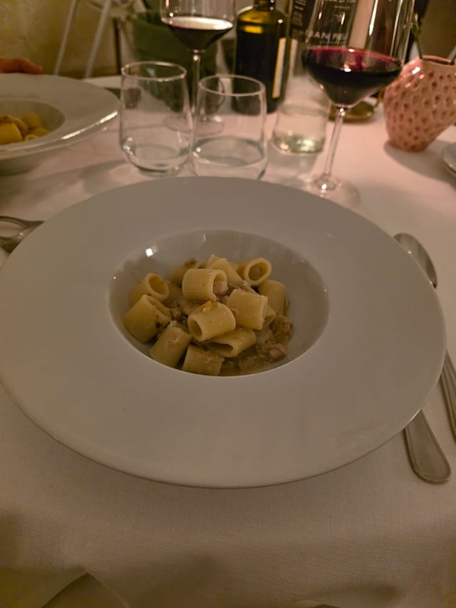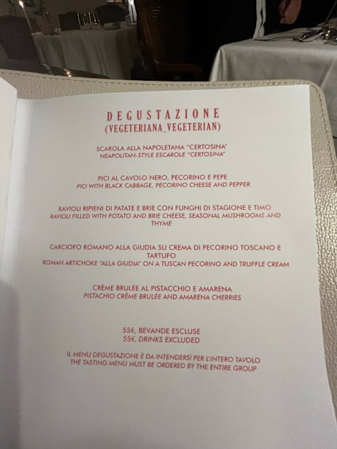 10/10+1My husband and I enjoyed the five course vegetarian tasting menu. We thought at 55 euros that it was an excellent value for the money, with interesting dishes and very tasty flavor combinations. All of our courses paired very well with a great Sicilian wine (Girolamo Russo Nerina Etna Blanco 2023) which was suggested by our lovely server, Aurrette who gave us exceptional service. The restaurant is bit far out of town, but we were very glad we came for dinner - especially because they were open on a Monday evening when many restaurants are closed.