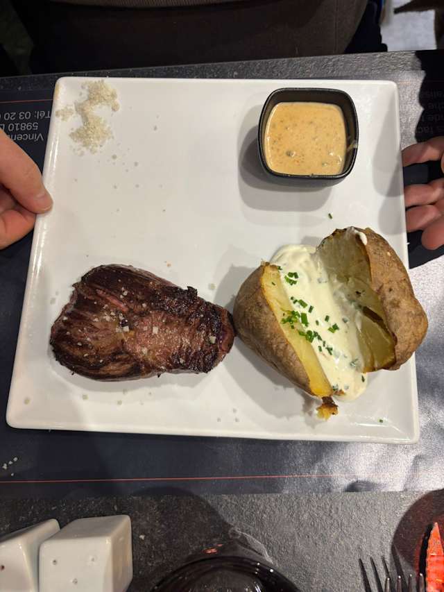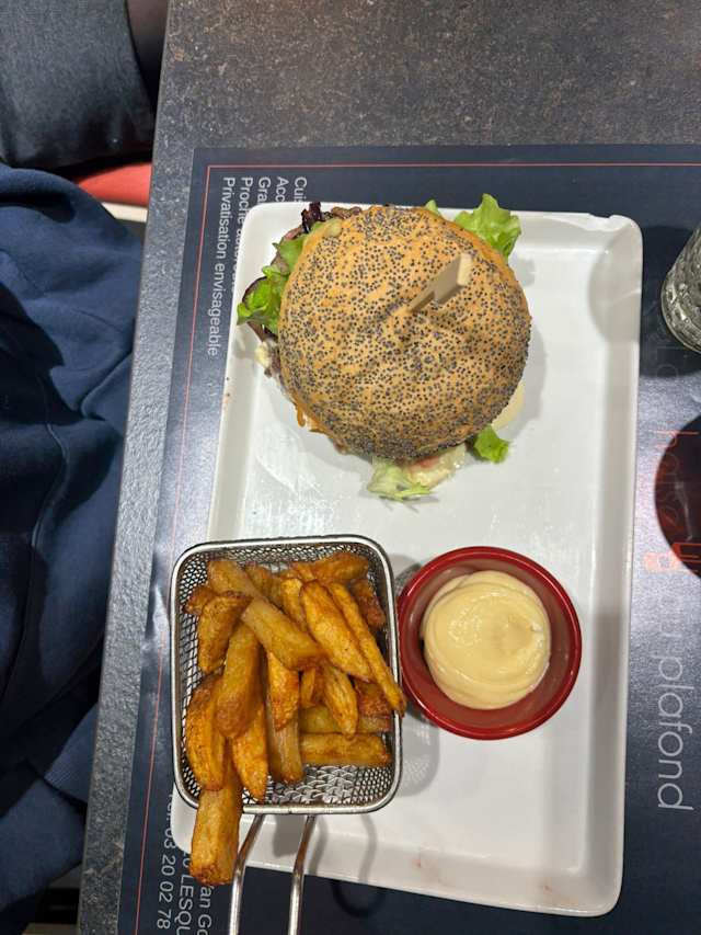 - Bun's, steak hachée, compoté d'oignons, tomate, salade, sauce maroilles
