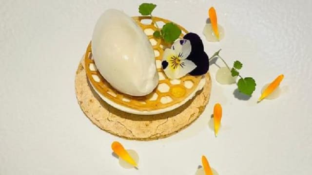 Espuma fromage blanc, voile de pêche, glace à la fleur de sureau