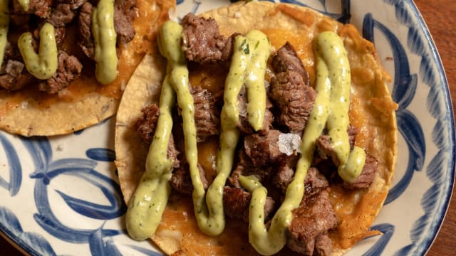 Tacos villamelón, brisket de ternera salteado, chorizo de toluca y salsa chipotle