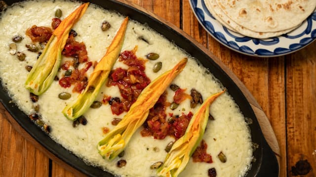 Tres quesos fundidos, flor de calabacín, pipas de calabaza y totopos
