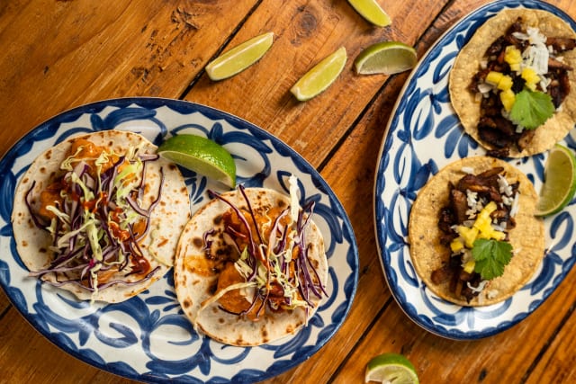 Tacos de solomillo zarandeado, queso fundido y salsa de aguacate