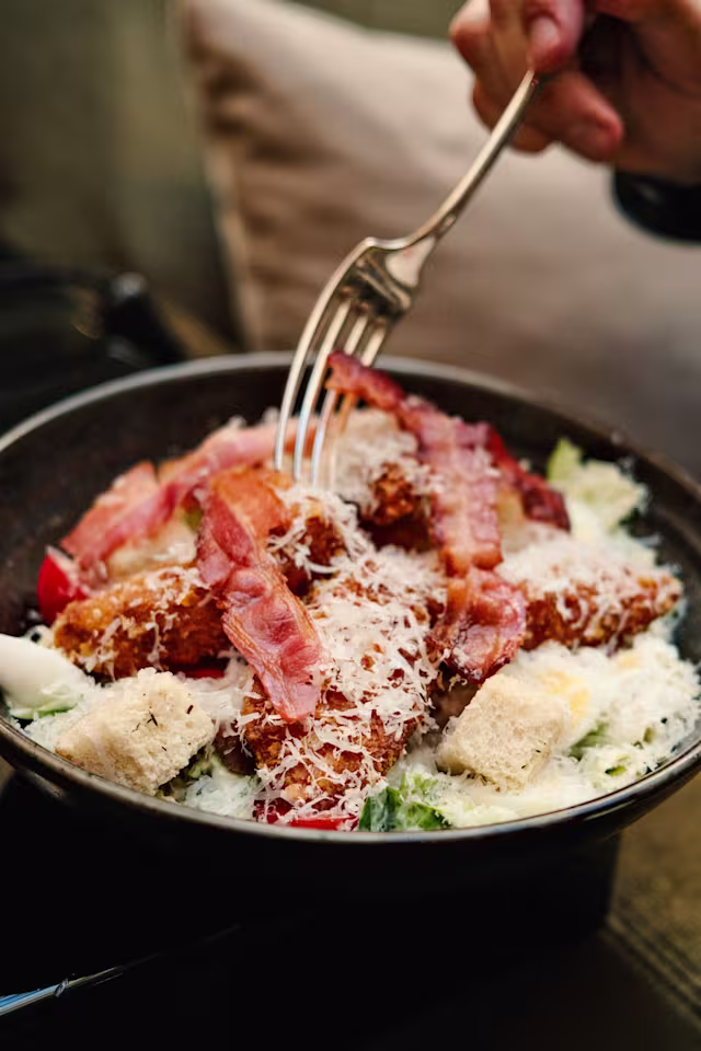 - Romaine, poulet pané, bacon, anchois, œuf, parmesan, croûtons et sauce césar