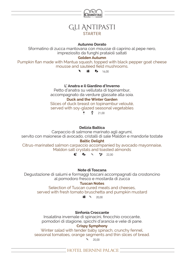 Dear Marco S, thanks for your beautiful review concerning your meal at La Chiostrina Restaurant. I am glad to read that you appreciated our central location and service. We will be happy to welcoming you back! Best regards, David Foschi General Manager BERNINI PALACE HOTEL