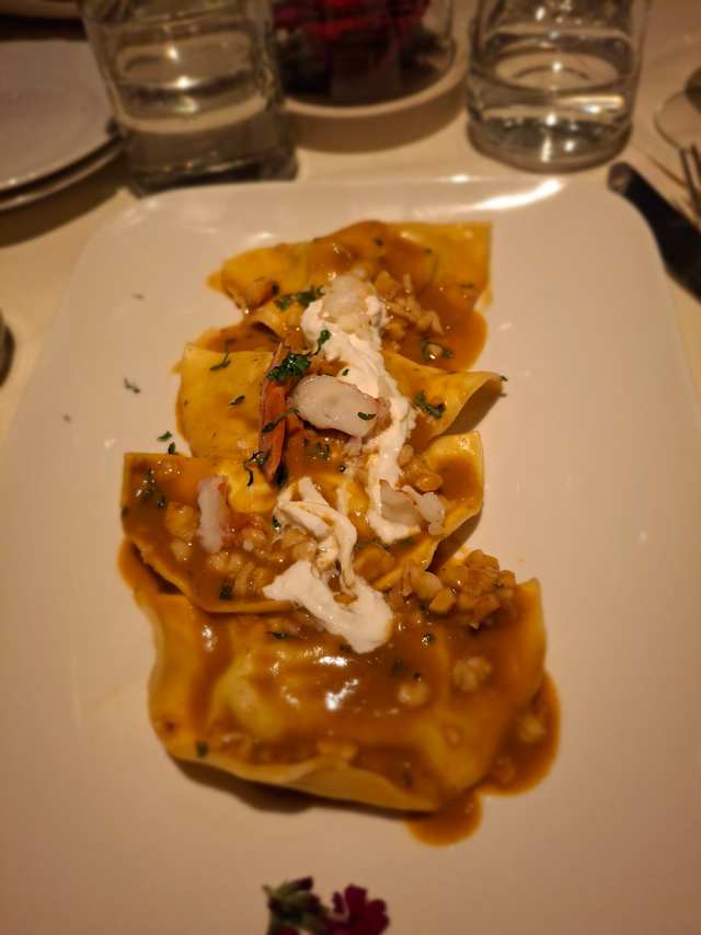 - Ravioli di gambero e stracciatella, su una bisque leggera aromatizzata al dragoncello