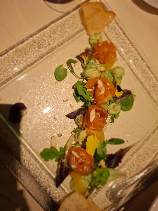 - Carpaccio di salmone marinato agli agrumi, servito con maionese di avocado, cristalli di sale maldon e mandorle tostate
