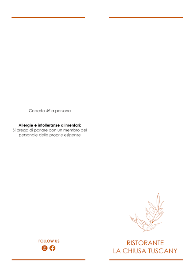 If you plan to eat at La Chiusa, the average price should be around €45. The average price is calculated based on appetizer/entrée or entrée/dessert, excluding drinks. Prices have been provided by the restaurant.