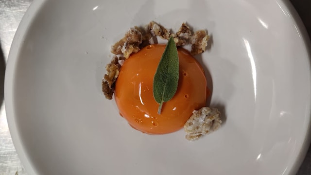 Semifreddo di miele - latte di cocco - pesca - crumble di nocciole