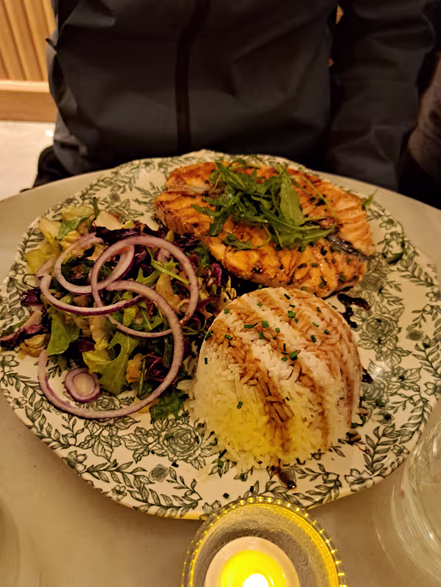 - Pavé de saumon snacké, sauce teriyaki, riz basmati et ratatouille maison