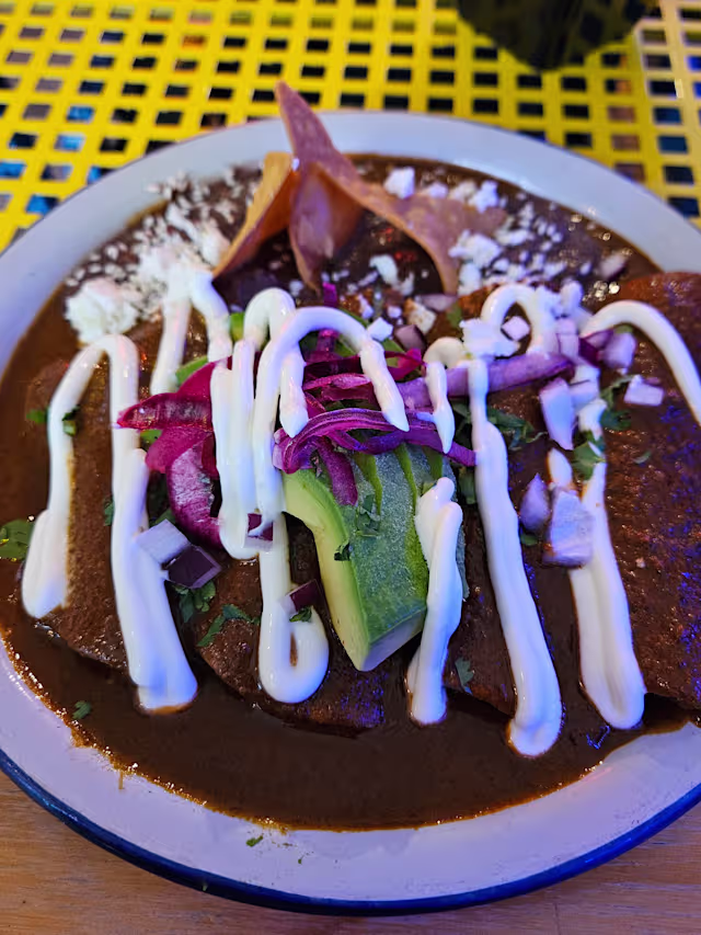 - Tostada de maíz, guacamole, frijol, pollo, crema, queso feta y pico de gallo