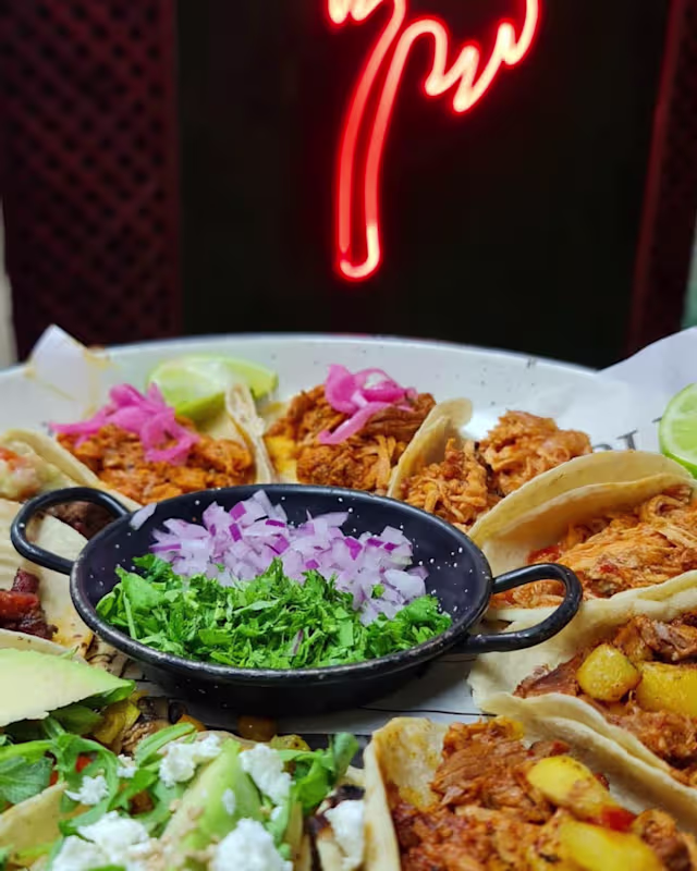 - Pulpo adobado al. pastor con cilantro, cebolla y piña tortilla de maíz