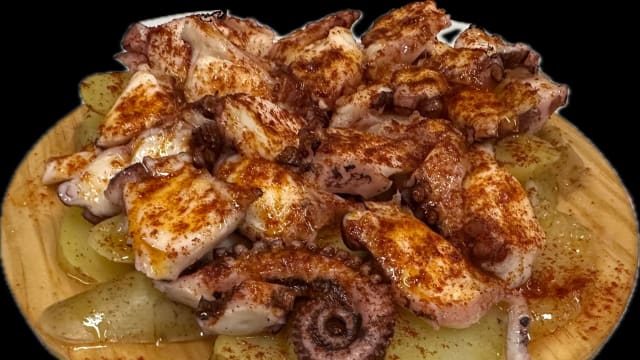 Pulpo servido de galicia y presentado con una cama de patatas con sal gruesa y espolvoreado de pimentón