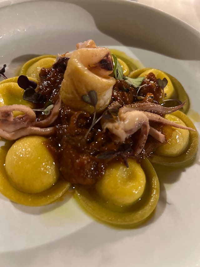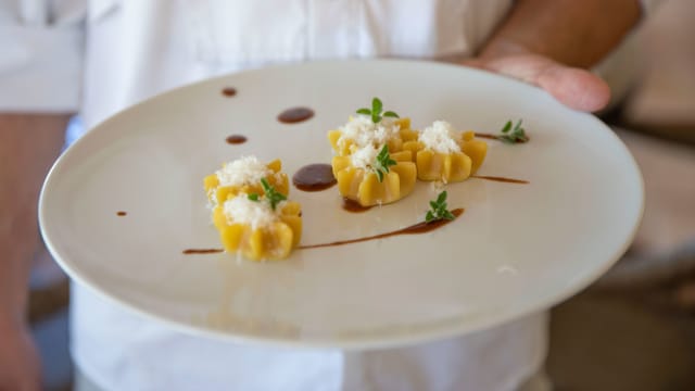 Chiusoni di semola, fonduta al Pecorino, salsa di pomodoro, riduzione di manzo e salsiccia