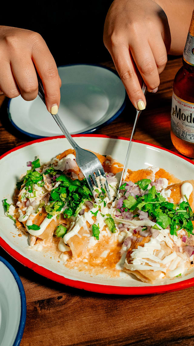 Totopos bañados en salsa picante verde (poco picante) o roja (muy picante). Relleno de pollo y con topping de cebolla y crema agria.