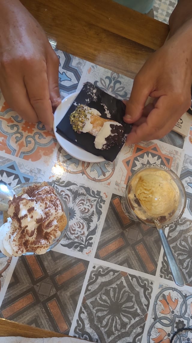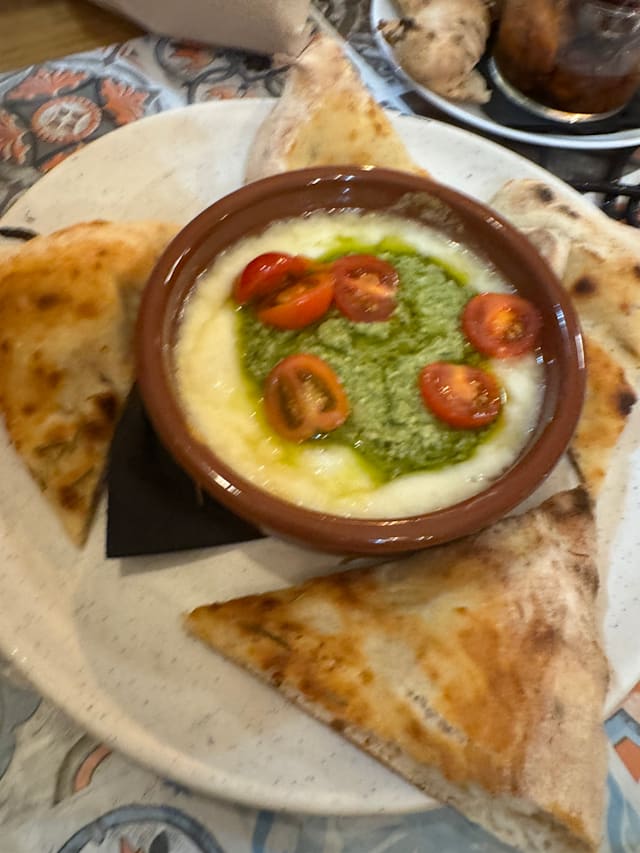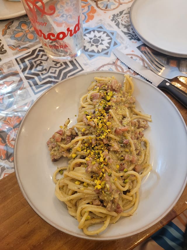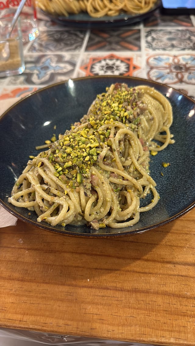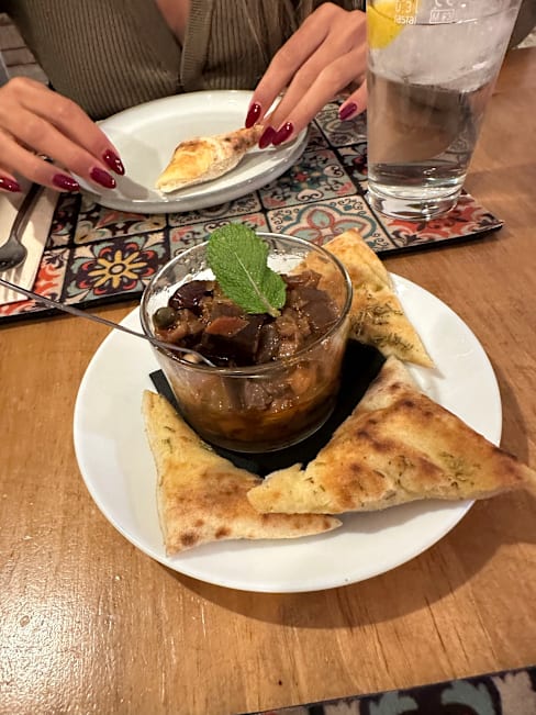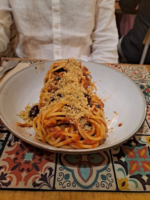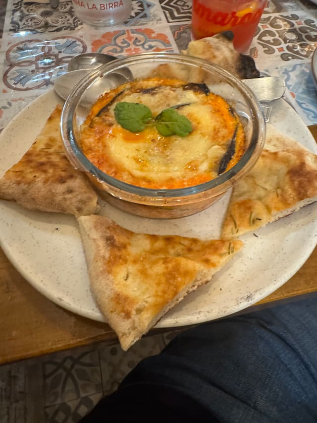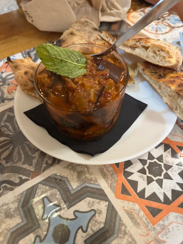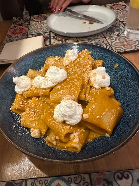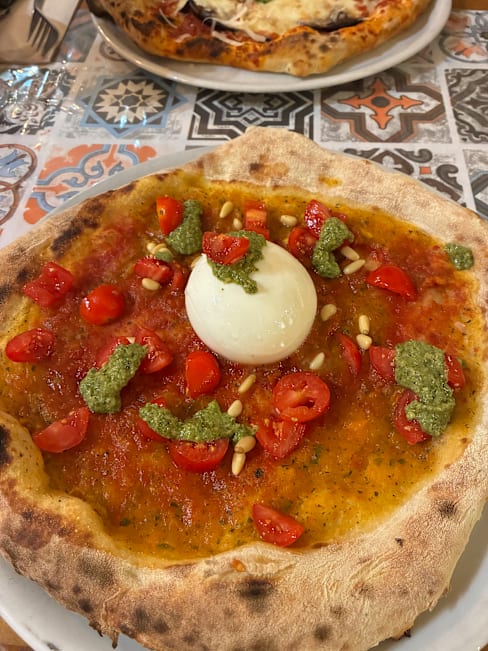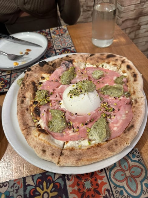 7.5/10+1First we had a caponata with fresh foccaccia that was amazing, then we had potatoes their way and they were wonderful. I had paccheri alla norma and they were seriously undercooked (and I love al dente), but there was a raw center inside. I wanted to let them know but couldn't get anyone's attention. For dessert we had a calzoncino, it is like a small calzone filled with pistachio cream and ricotta. I didn't like it that much since it was way too sweet, I missed the nuttiness of pistachios and the saltiness. We got a limoncello as a gift in the end. All in all, the food was good, especially the starters, but there is room for progress. The service was mostly very kind. The ambiance was really lovely and pretty. I will go again to try the pizzas as that seems their go to dish.