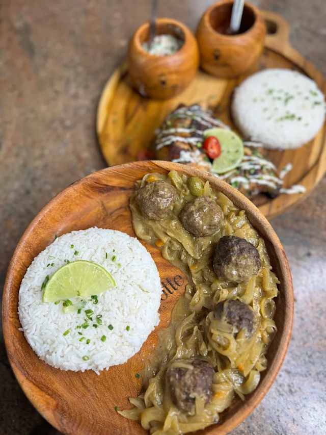 - Oignons finement émincés, mijotés avec de la moutarde et du citron boulettes de viande pure boeuf ou option veggie. Accompagnement : riz parfumé