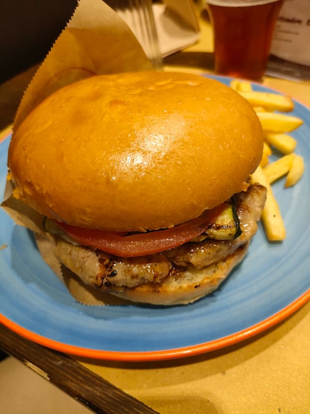 Pane artigianale, hamburger di carne a scelta dalla nostra selezione, cheddar, cipolla rossa caramellata alla bbq, bacon croccante, servito con contorno a scelta di patate fritte oppure verdure grigliate (melanzane zucchine)