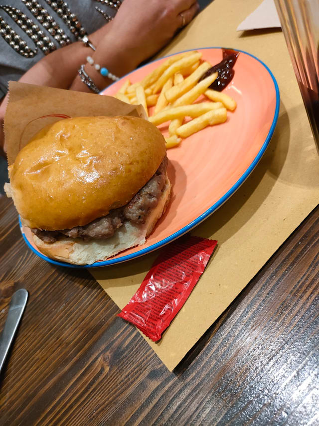 Pane al latte, hamburger di fassona 100 g, cheddar, servito con contorno di patatine fritte. Bibita analcolica a scelta compresa.