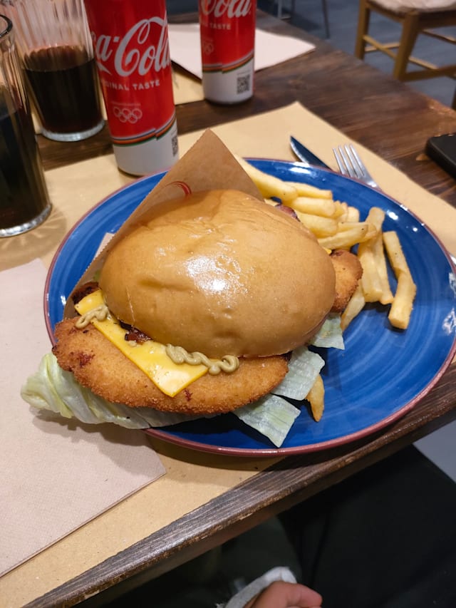 Pane al latte, cotoletta di pollo 100 g accompagnato da patate fritte. Bibita analcolica a scelta compresa.