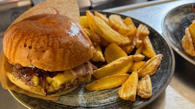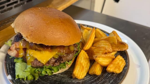 Pane artigianale, hamburger di carne a scelta dalla nostra selezione, insalata gentile, cheddar, bacon croccante, pomodoro ramato, anello di cipolla pastellato in birra e fritto, salsa honey mustard home made