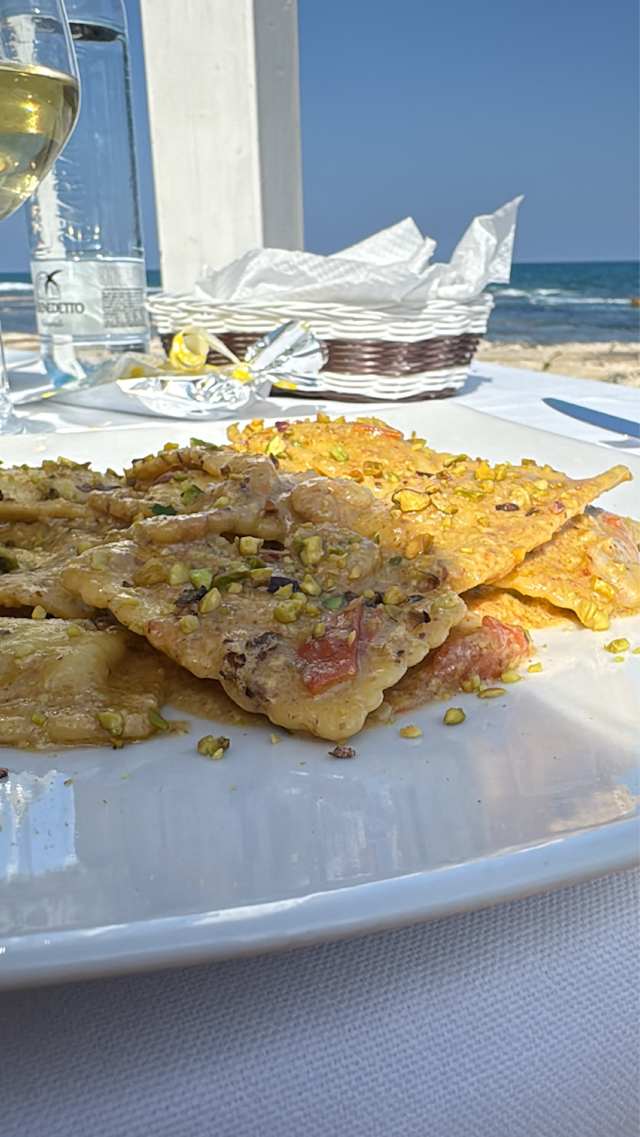 - Raviolini di cernia con gamberetti, pomodorino, pesto e granella di pistacchio, olio evo