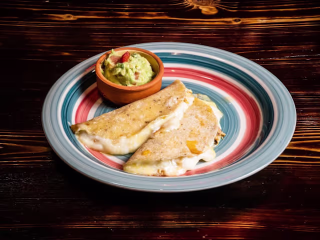 - Consiste en una tortilla de maíz doblada por la mitad, rellena de queso y con una guarnición de guacamole.