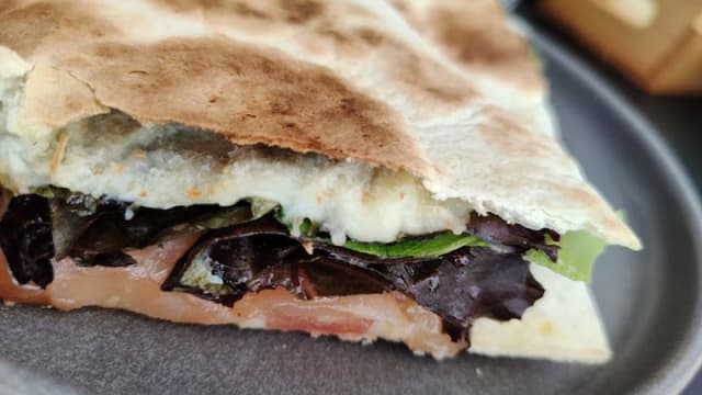 Salada, mozzarella, tomate, pepino, pêra abacate, cebola roxa, pimento encarnado e molho de mostarda
