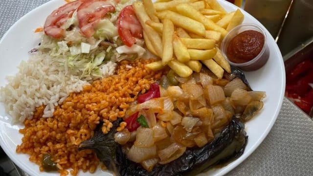 (Aubergine farcie aux oignons, frites, blé concassé et crudités)