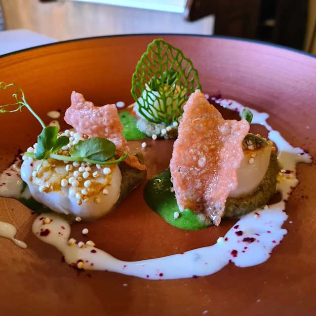 - Capesante / Scallops “Saint George scottata, su salsa di piselli e menta,zucca arrosto,mayonese di raperosse e chips di riso “Saint George scallops, seared, on pea and mint sauce, roasted pumpkin, rapeseed mayonnaise and rice chips „Gesäumte Saint-Georges-angebraten, auf Erbsen-Minz-Sauce, geröstetem Kürbis, Rapsmayonnaise und Reischips (D,P) € 22.00