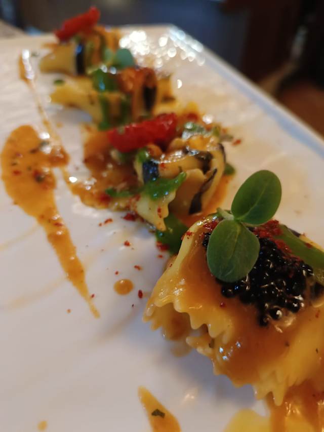 - Tortelloni del Cantabrico / Tortelloni from the Cantabrian (home made) ripieno di burrata , acciughe del Cantabrico,bisque di crostacei e caviale di aringa (home made) stuffed with burrata, Cantabrian anchovies,shellfish bisque and herring caviar (hausgemacht) gefüllt mit Burrata, kantabrischen Sardellen,Muschelsuppe und Heringskaviar (A,B,C,F,G.D,) € 22.00
