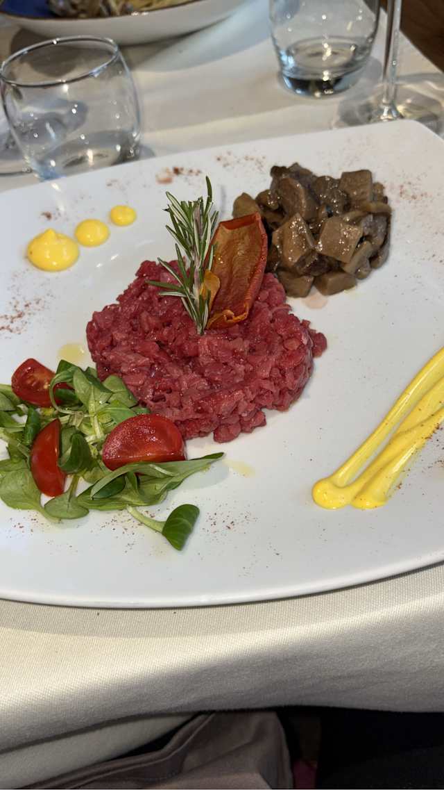 - Linguine rum allo zafferano, tartare di gamberi e polvere di caffe