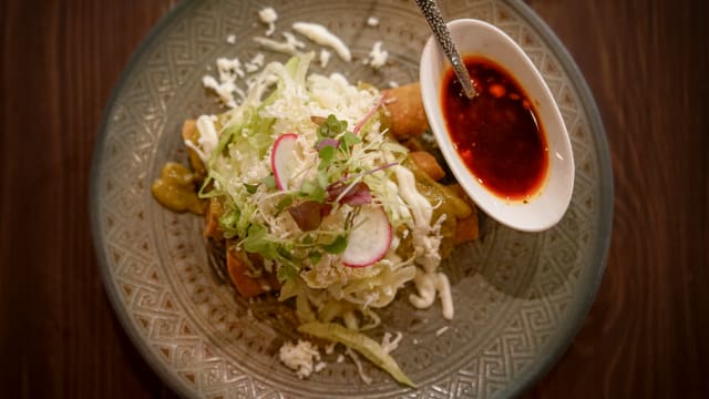 Crujientes totopos de maíz bañados en salsa verde de tomatillo o roja de jitomate, coronados con queso fresco, crema y un toque de cebolla y cilantro fresco.