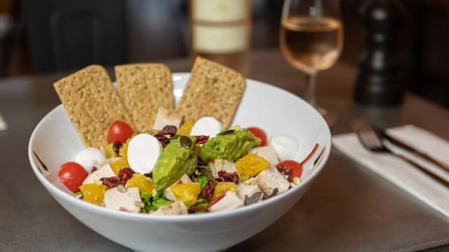Salade, filet de poulet, guacamole, quartiers d’orange, cranberries séchées, mozzarella de bufflonne et graines
