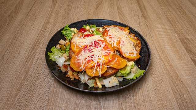 - Sauce fromagère et emmental, accompagnée d'une salade composée.