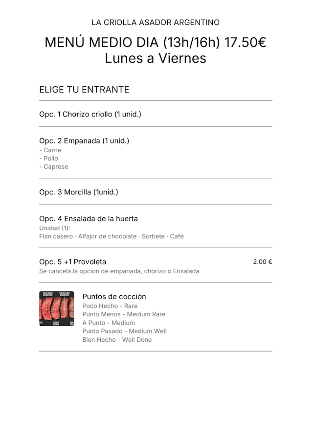 10/10Tried this new restaurant and loved it. The starter - chorizo - was delicious and tasted like a real Argentinian one. We then had Asado de Tira and Ojo de Bife and both were perfectly cooked and seasoned. Last, my partner had grilled veggies as side dish and those were also very good .all in all, highly recommended!!