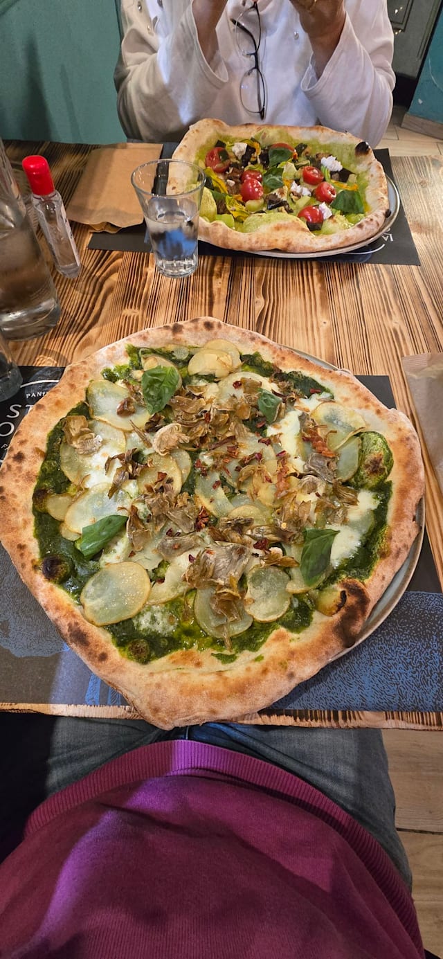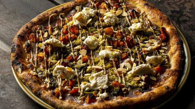 Prosciutto cotto, carciofini fritti, funghi di stagione, mozzarella fiordilatte, salsa di pomodoro san marzano, polvere di olive, basilico, olio evo