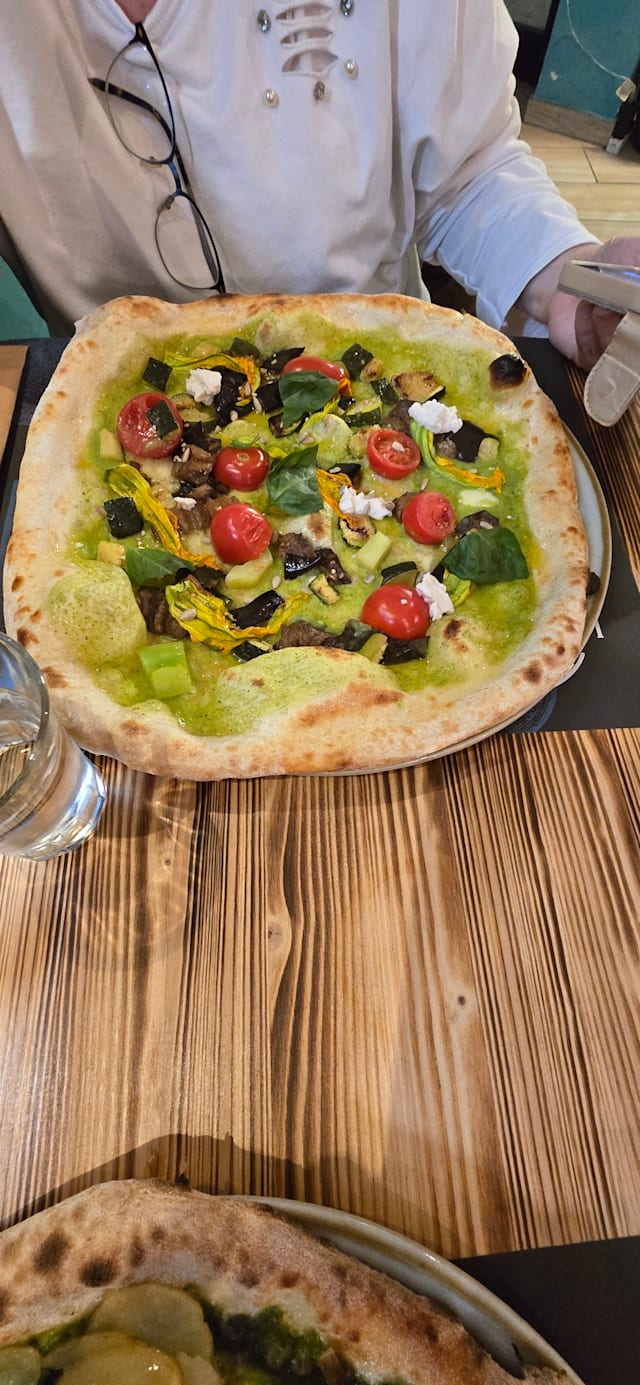 Guanciale, zucchine, vellutata di zucchine, fiori di zucca, mozzarella fiordilatte, pecorino croccante, basilico, olio evo