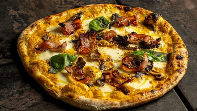 Guanciale, crema carbonara, mozzarella fiordilatte, pecorino croccante, olio evo