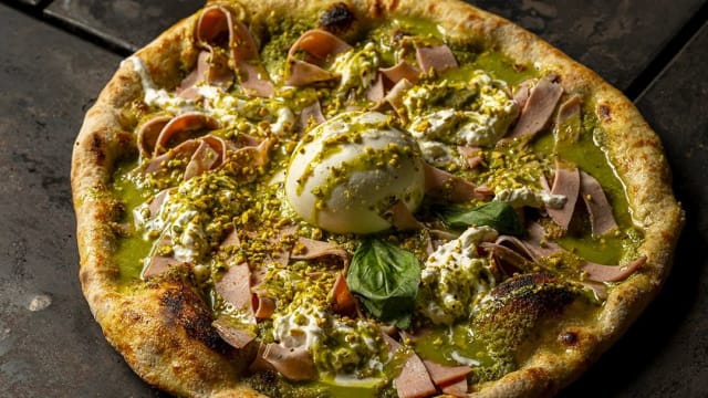 Crema cacio e pepe, pesto di pistacchio con la sua granella, mortadella, burratina, stracciatella, basilico, olio evo