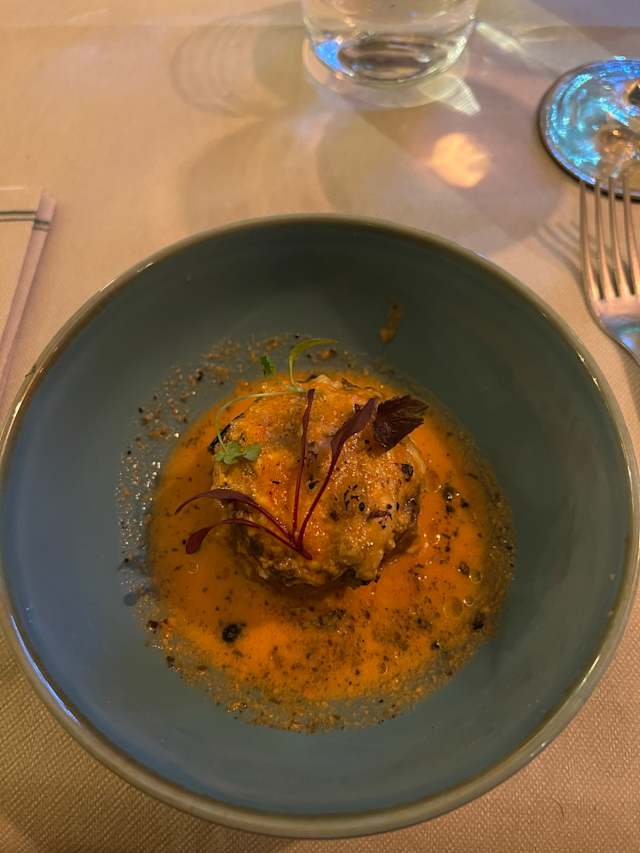 - 2 ostriche ,gambero Rosso marinato al lime e maionese all'aneto scapo con pomata di aglio nero e polvere di capperi tagliolini di seppia con gazpacho di pomodoro e caviale