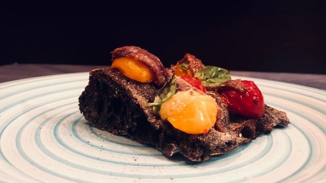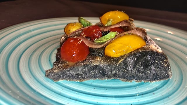 - Impasto al nero di seppia pomodoro giallo appasito polvere di cappero caviale e acciugha del mar cantabrico